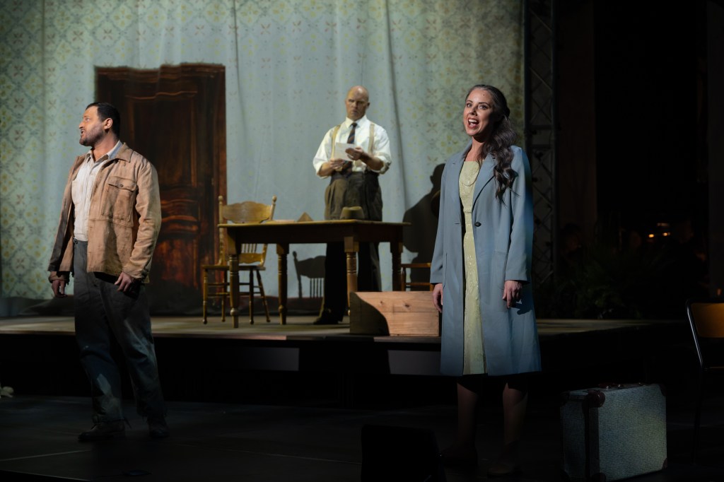 Desiree Frahn was expressive as Ellen, with a powerful voice and emotive performance. Simon Meadows sang the role of Holland with similar vigour, and Michael Petruccelli brought a charismatic intensity to the role of The Stranger. Samuel Dundas sang the role of Cave, and Natalie Jones and Dimity Shepherd played the nosy but well-intentioned Sprunt Sisters, who lived on the neighbouring property and offered advice to Holland and commentary to everyone else. Their gossip to new arrivals in town doubled as exposition for the audience.