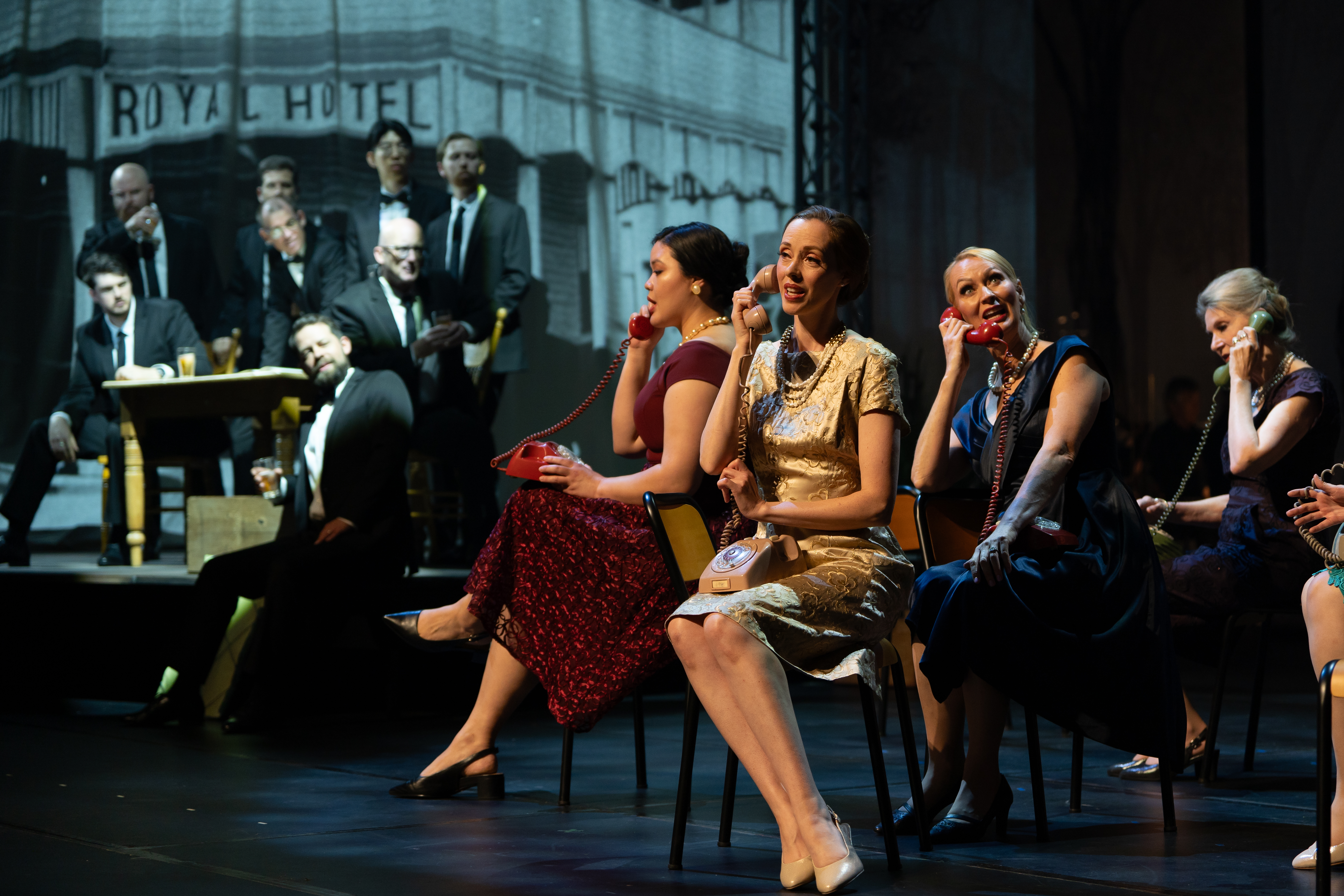 Mills’ score conjured creaking gums and stormy nights, and the Chorus was composed of gossiping neighbours in Ellen and Holland’s small town, gathering at the pub and spreading news through the town via telephone. The opera was sung and surtitled in English, and a repeating, rhythmic chant listing the Latin names of the different eucalyptus species was a highlight.