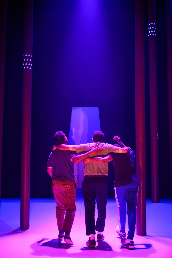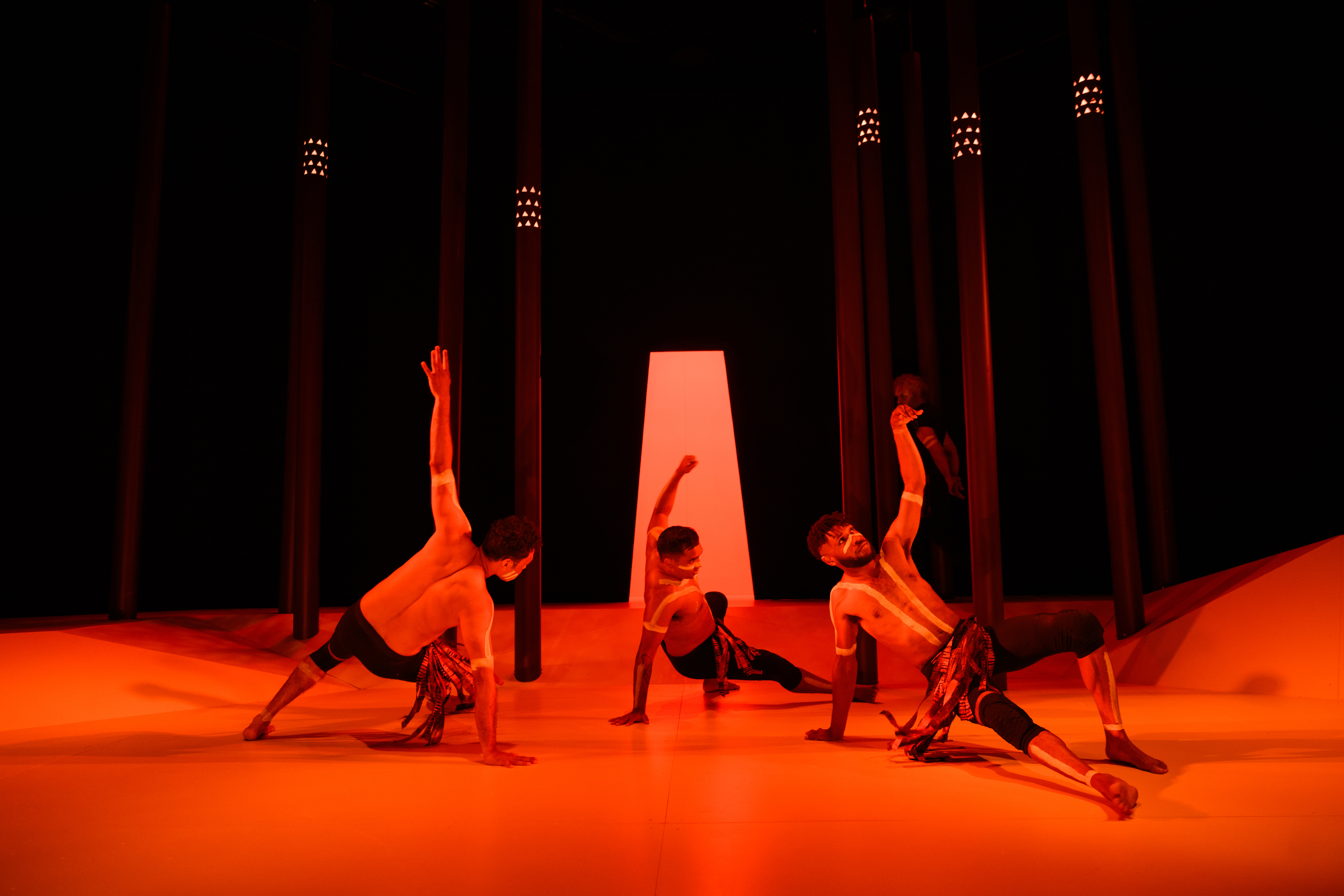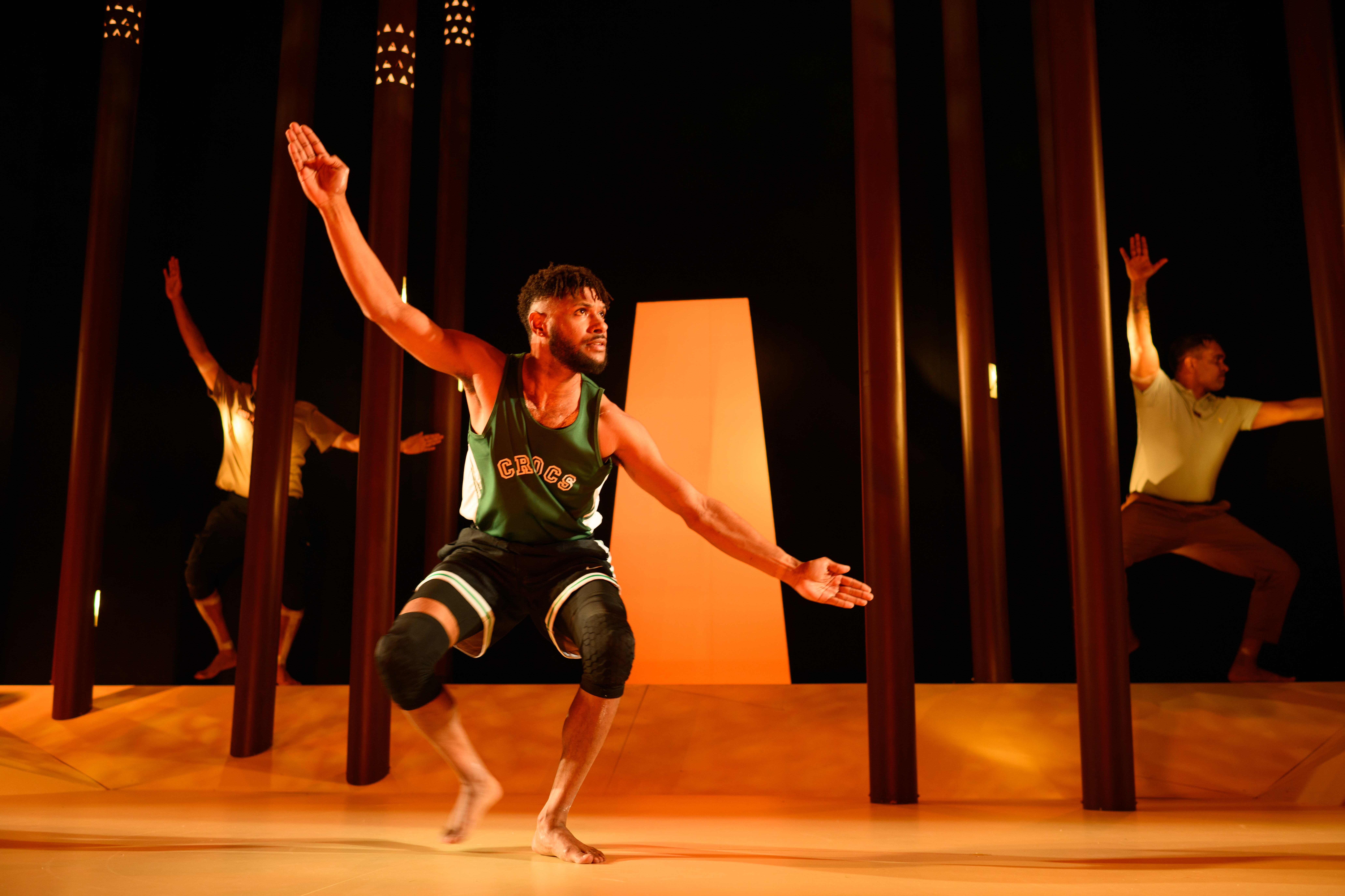 Set design by Kevin O’Brien featured large poles that suggested both rainforest landscape and cityscape. A sloping stage area leading towards a doorway served as the main entry and exit point for the performers and tied to the play’s themes of crossing thresholds. Vibrant lighting design by David Walters and sound design by Brendon Boney, realised by Wil Hughes, brought together the mythical and the modern. Costume design by Delvene Cockatoo-Collins added to each man’s character and tied them to their history and each other with shimmering copper details even on their modern streetwear.