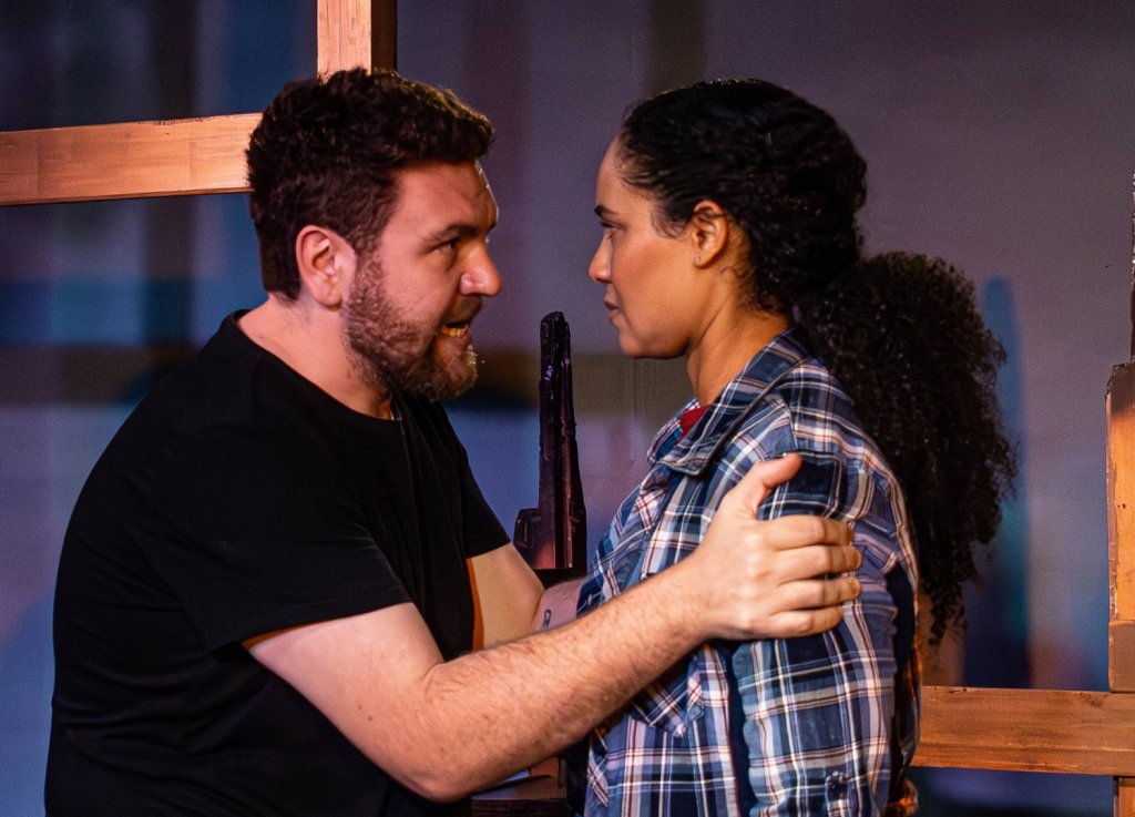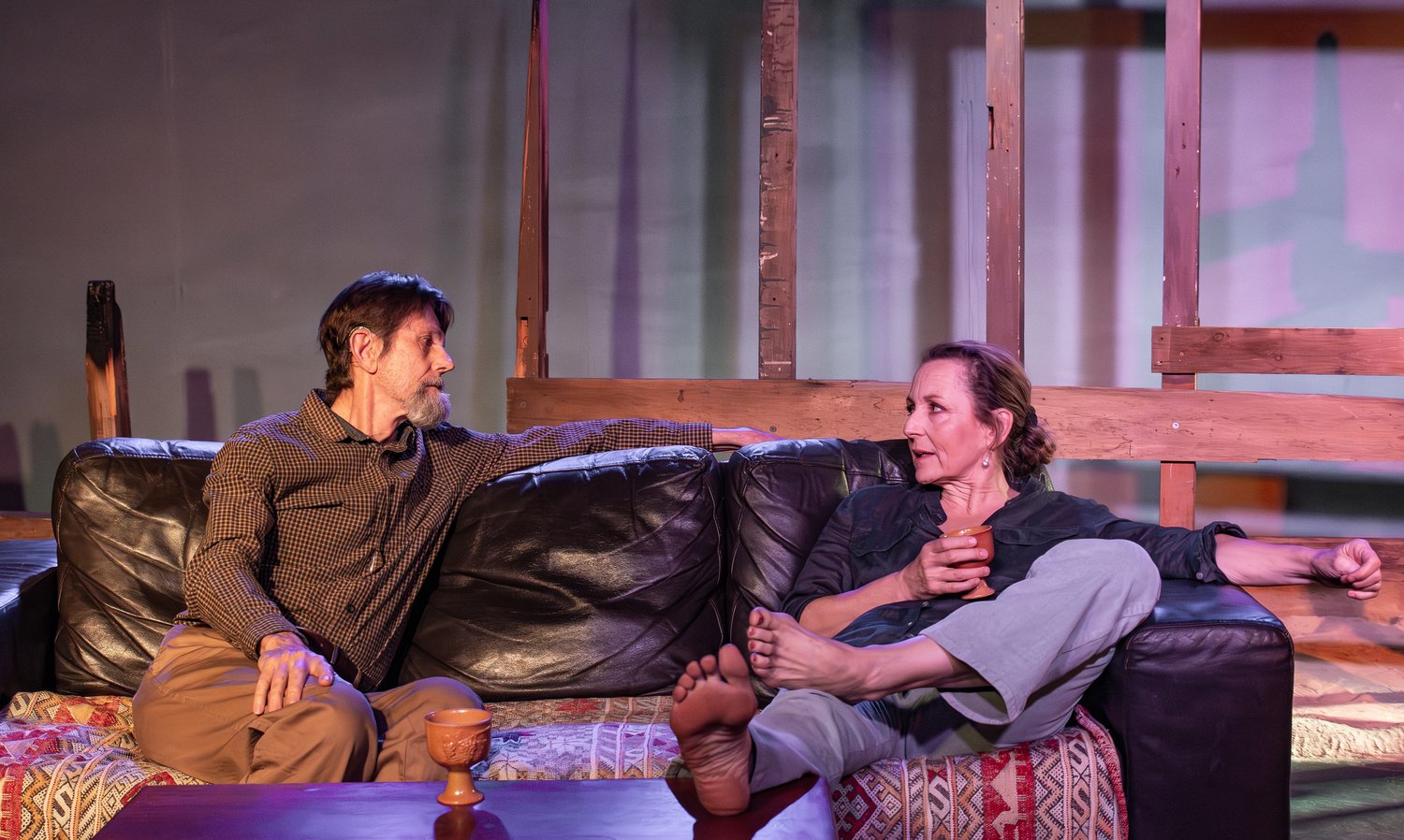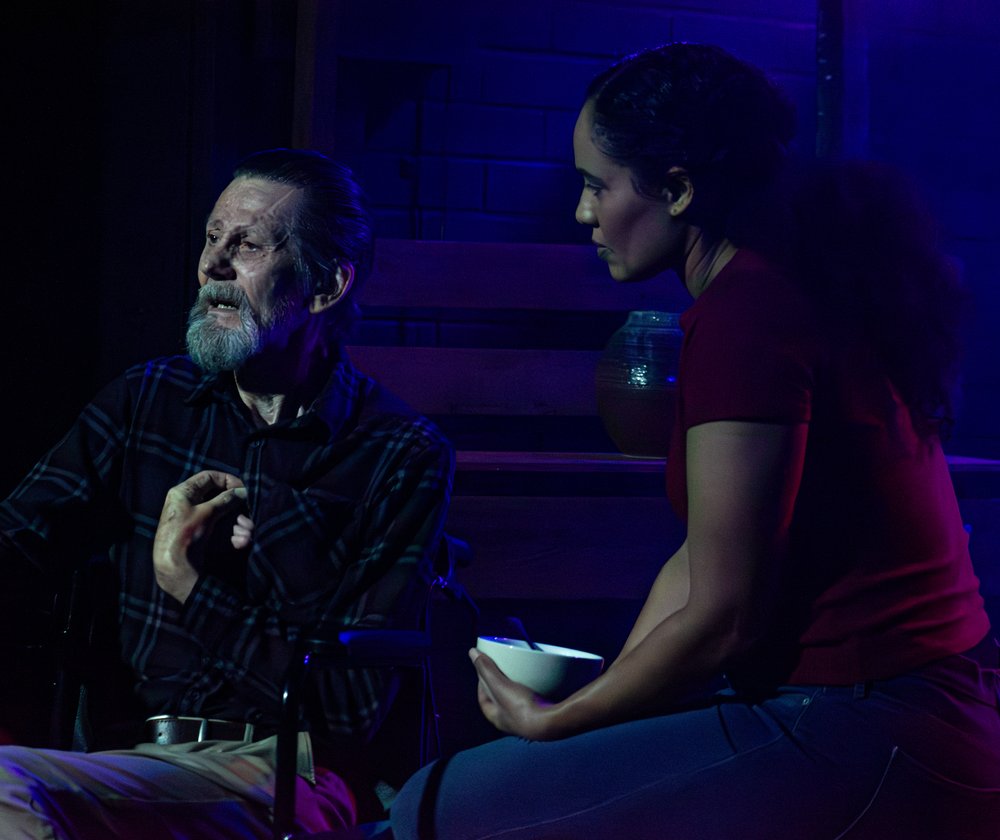 Lighting design by Madelyne Leite suggested desert sunsets and moonlight, with a blank backdrop serving as an endless horizon and the canvas for the lighting. Set and costume design by Ada Lukin built a framework of Alex’s home in the desert, with sand swept around the base, and compositions by Zachary Miezio also evoked the desert surroundings with the hum of evenings and chirping crickets.