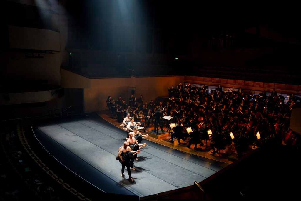 Following an interval, during which the stage was adjusted to create a performance space between the orchestra and the audience, the concert resumed with The Rite of Spring. Ten Circa acrobats entered the stage as the orchestra tuned up.