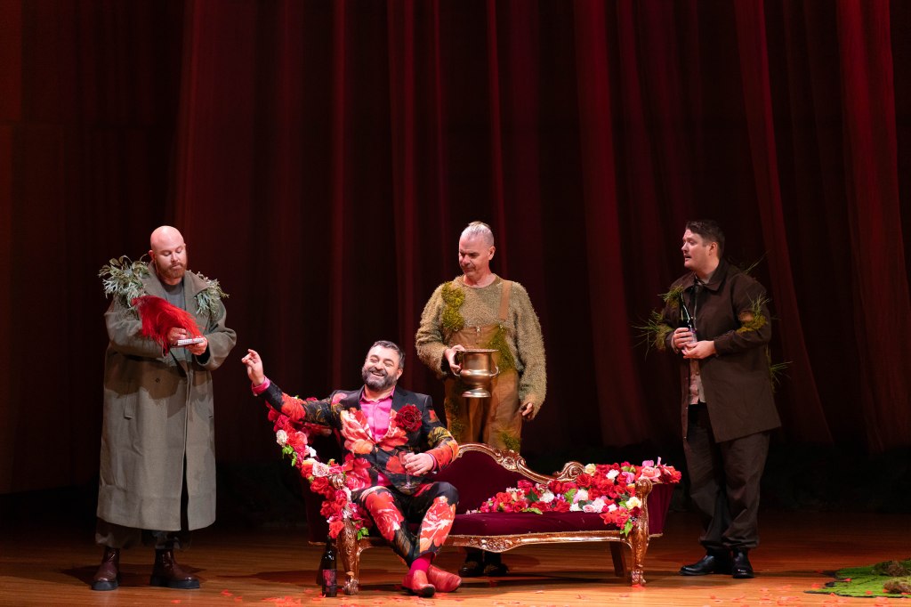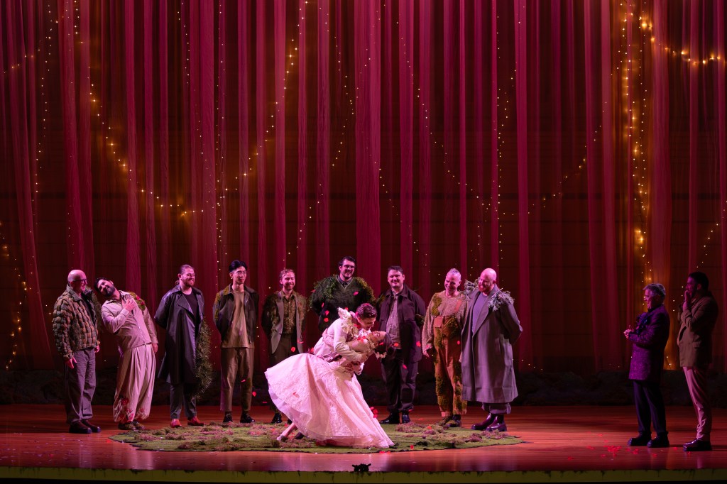 Hansford’s set design was simple but charming, with a sheer pink backdrop and a few pieces of furniture that seemed overgrown with moss and flowers, evoking an enchanted woodland. In the same style, costuming by Karen Cochet and Bianca Bulley drew inspiration from both nature and couture to dress the Chorus in mossy greens and browns and the lead characters in shades of cream and vibrant pinks and reds. Lighting design by Christine Felmingham shifted audience attention across the minimalist stage, bathing most scenes in shades of pink and illuminating the royal household with the warm glow of fairy lights.