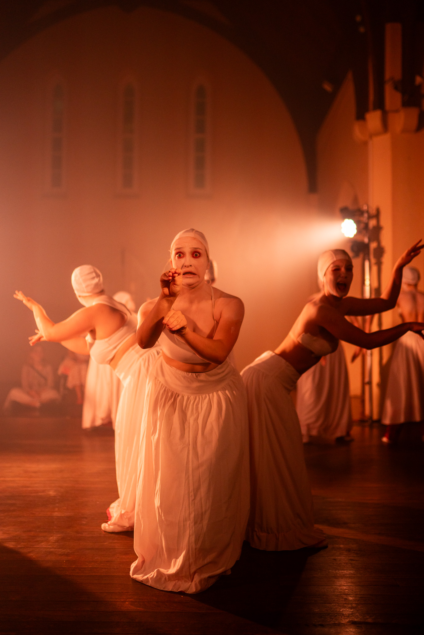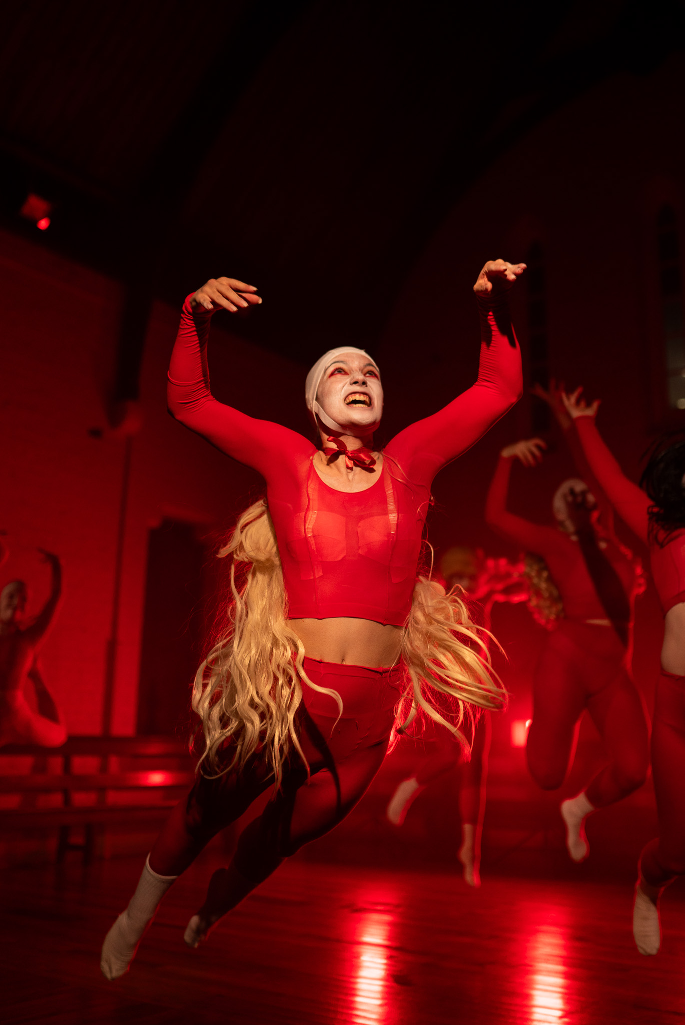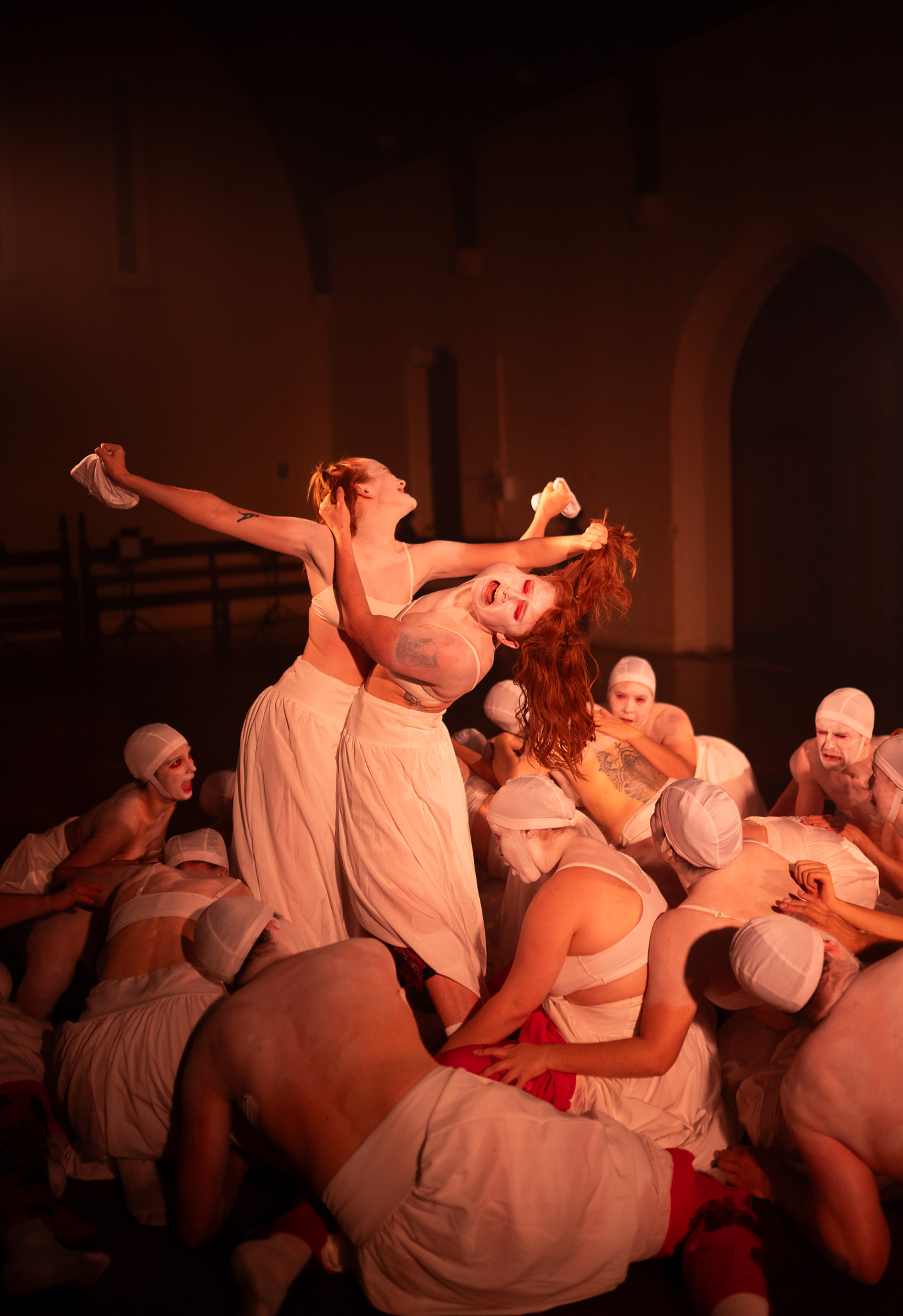 The costuming was designed by Morris and realised by Maxi Mossman, Shanne O’Leary, Ebony Webb and Mia Sibley. Dressed in stark white that slowly revealed layers of patchworked reds and oranges, the ensemble artists wore white caps over their hair and white paint across their chests and faces, with dramatic red makeup that further exaggerated their expressions.