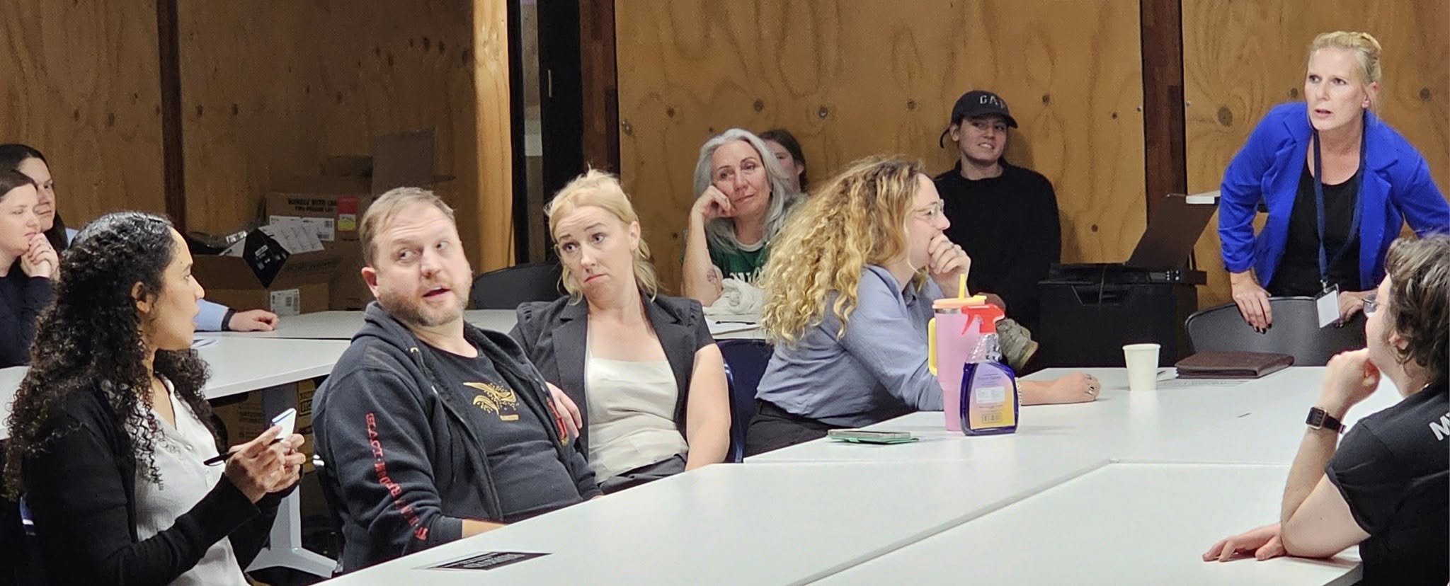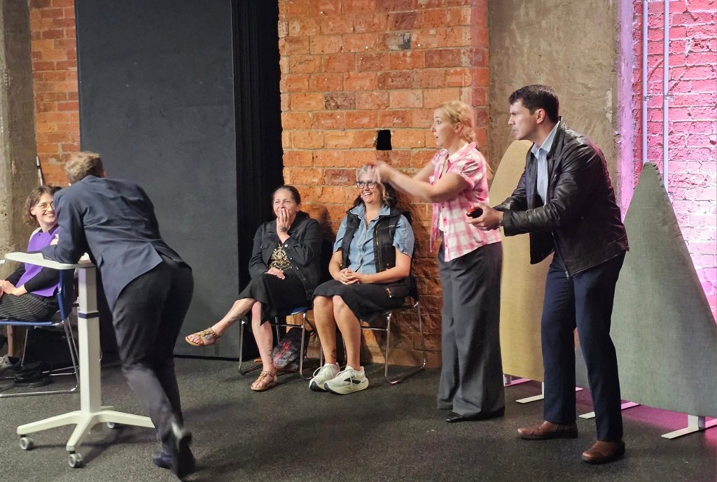 The audience was welcomed to their “first day on the job” by their new colleagues and ushered through the hallways to choose a seat for the performance. Directed by Julie Ritchey and Ava Moschetti, She Works Hard for (No) Money was staged within The Precinct, a coworking space in Fortitude Valley. Their direction made the most of the office space and existing furniture, crafting an especially impactful scene in the office kitchenette and creating dynamic, fluid transitions between scenes with a range of entry and exit points. In addition to various office settings, some of the sketches were set in a trivia-style game show, a quiet kitchen, and as part of a podcast or talk show.