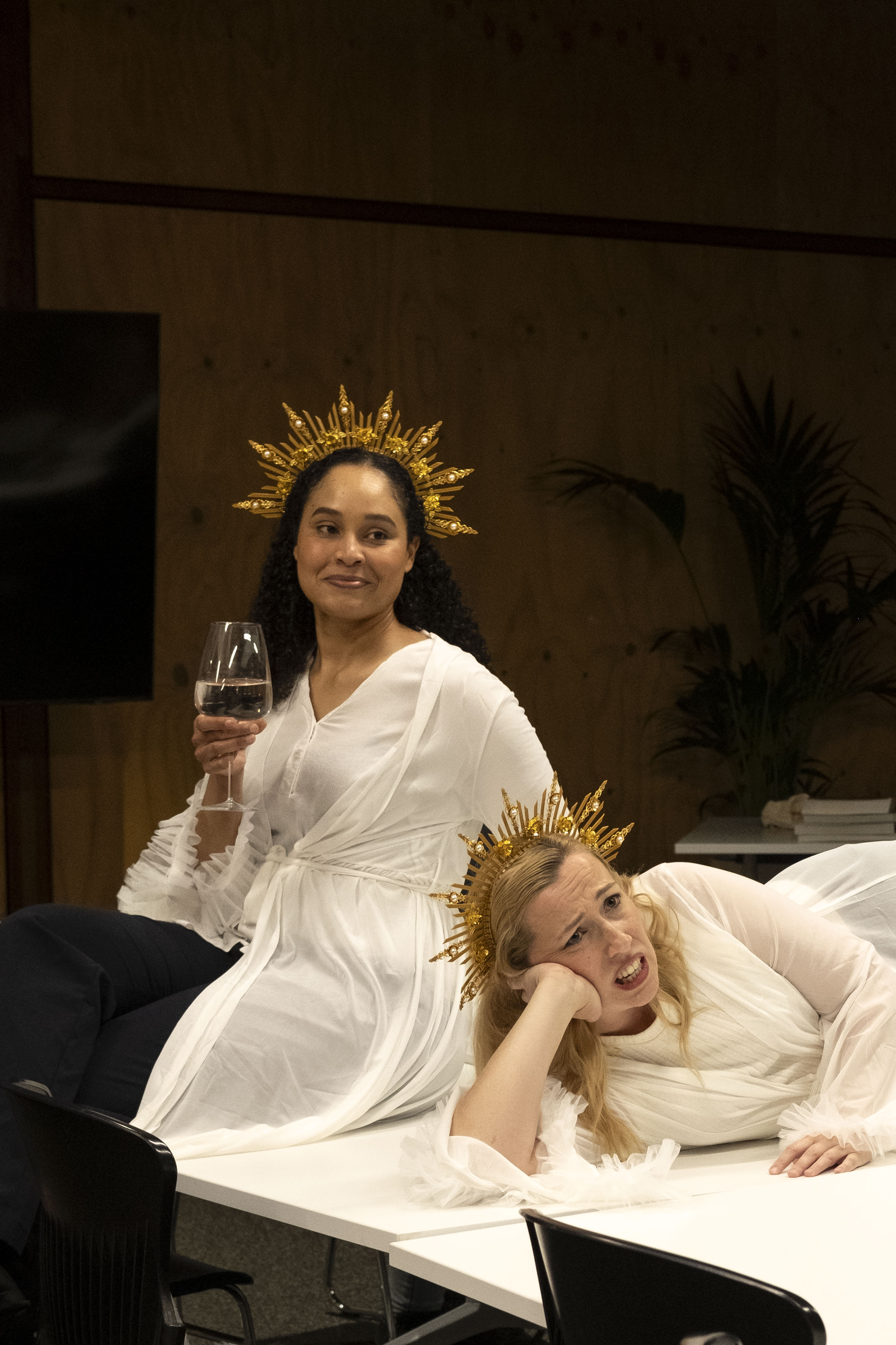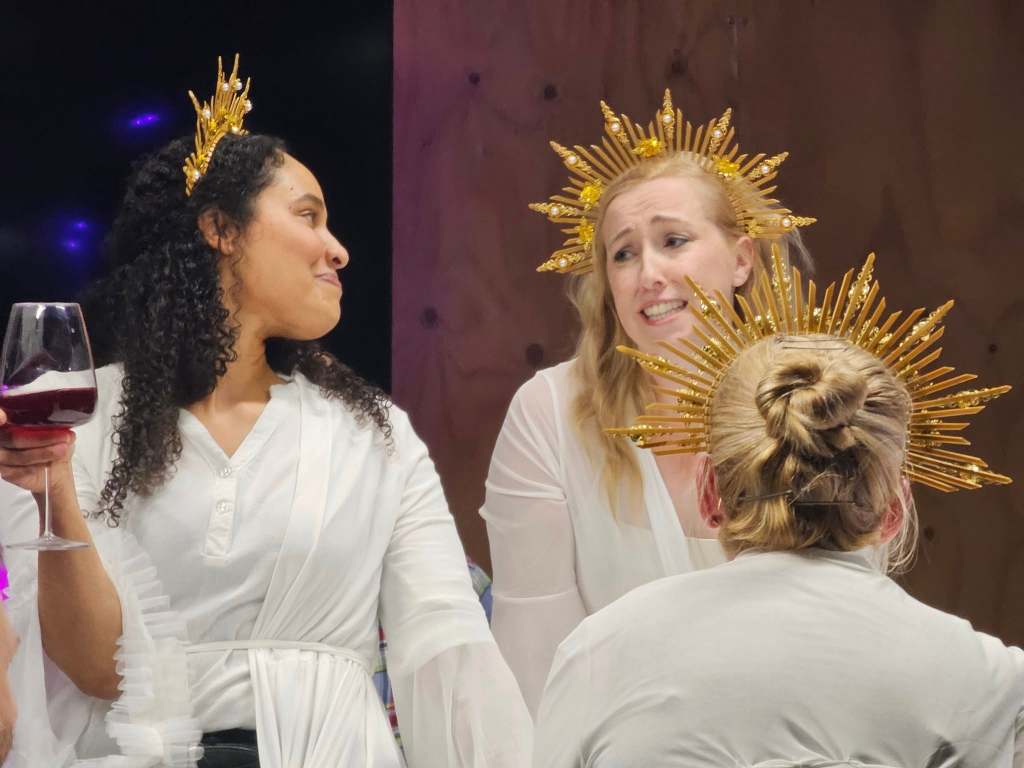 Written and produced by Hill, the play moved through a series of vignettes that approached these core themes with varying levels of satire and absurdity. While many of the sketches were unrelated, there was some character continuity throughout – particularly, a pair of colleagues (Ellen Hardisty and Rob Wainwright) sharing an office and a couple (Carla Haynes and Connor Scoble) navigating a scheduling issue for an upcoming family birthday. Other recurring characters included the Domestic Goddesses (Haynes, Hardisty, and Phoebe Maher), with their glowing brooms and complaints about husbands and boyfriends that escalated to ludicrous and dangerous levels.
