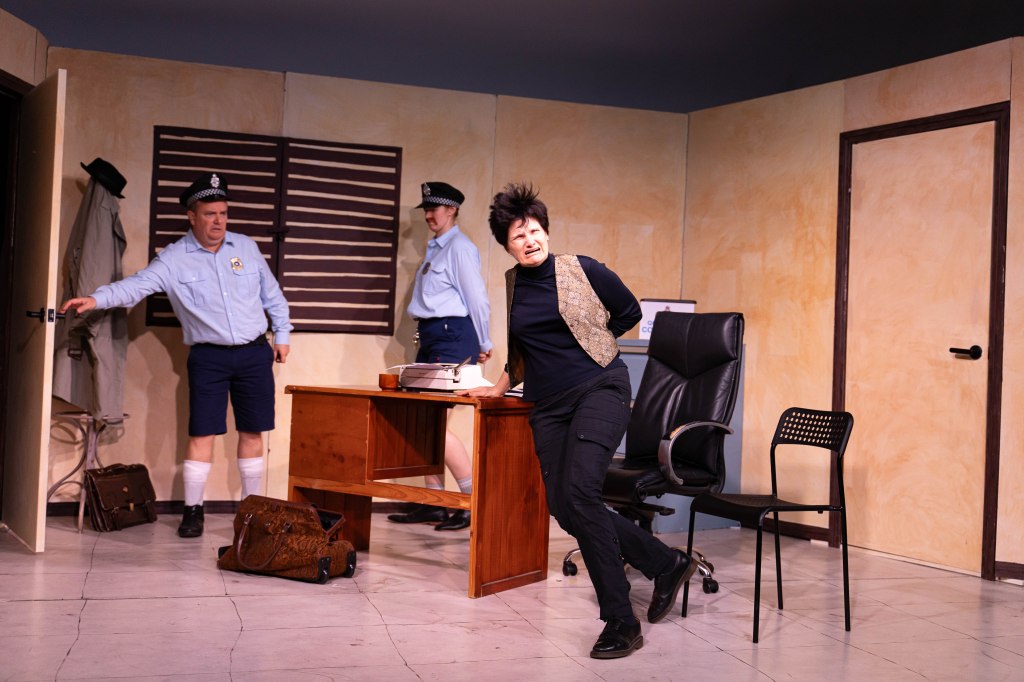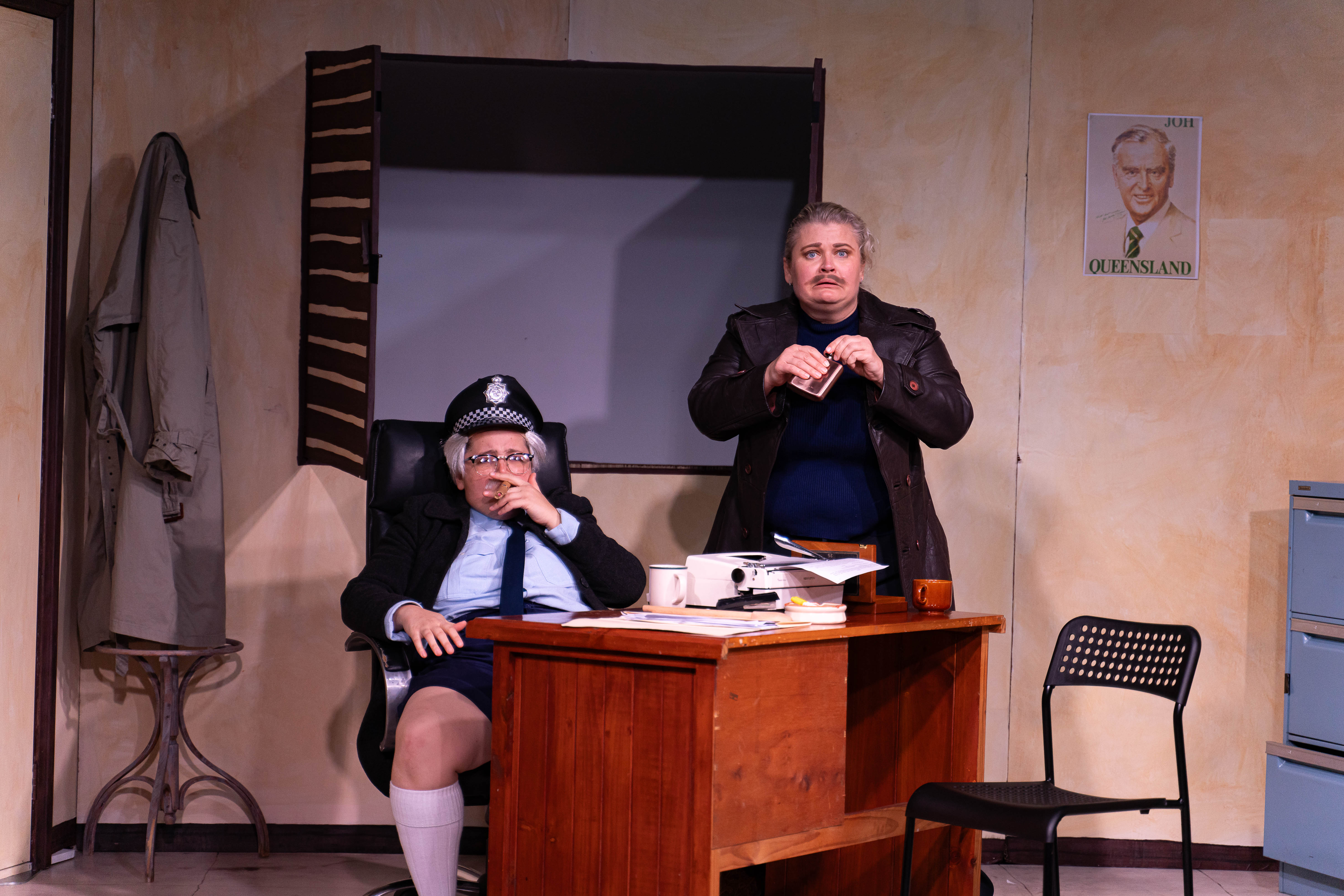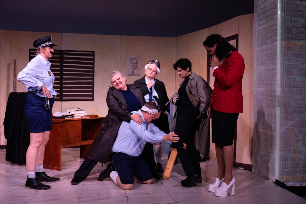 Set design by Laurent Milton surrounded the action inside the police station with high walls and winked to Bjelke-Petersen’s Queensland in the details, such as brown paper bags of bribe money strewn across the station, an electric paper shredder labelled “Complaints”, and a framed portrait of the former Premier that was kissed and genuflected to. Lighting design by Noah Milne and sound design by Peter van Brucken brought further depth to both the emotion and comedy of the play, furthering the absurdism in many scenes and incorporating some iconic Australian music.