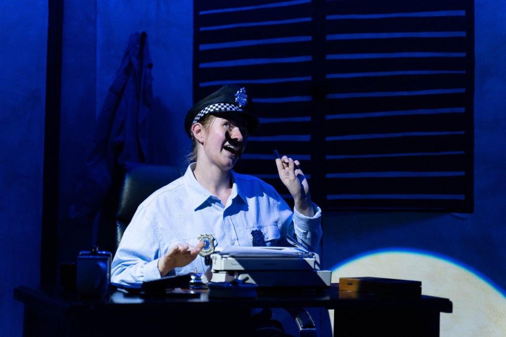 Deidre Grace was magnetic as the Maniac in his many guises. She adopted the increasingly absurd characterisations with utmost seriousness, her movements sharp and lively and her eyes alight with mischief. Rebel Star played a gruff and frequently exasperated Superintendent Biscoff and Izabela Wasilewska was a swaggering, leather-clad Detective Hallaran, frequently wide-eyed with rage or concern. Dana Summer played the eager-to-please PC Sherbert (a dual character, demonstrated through split costuming), who was often left unsupervised to dance or compose a “duet” with himself to great comedic effect. In addition to his highly physical role in the first half, Isaiah Harrison played a skeptical journalist who arrived in the second half to interview the Superintendent over the death of the anarchist.