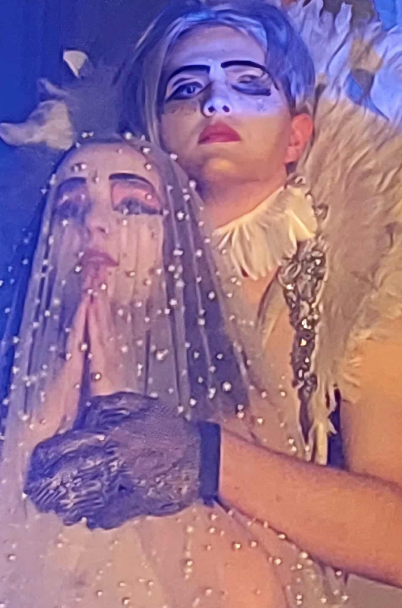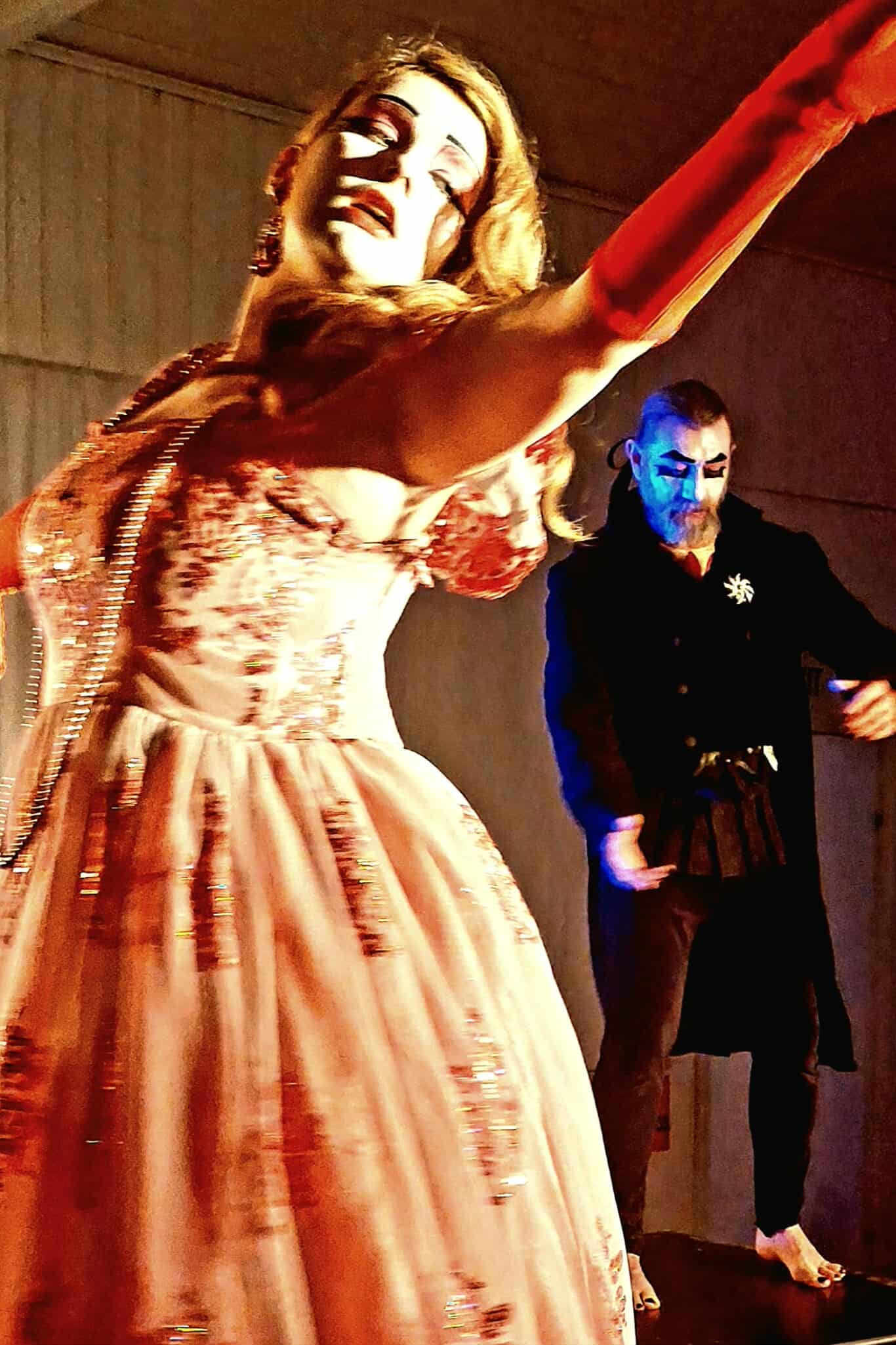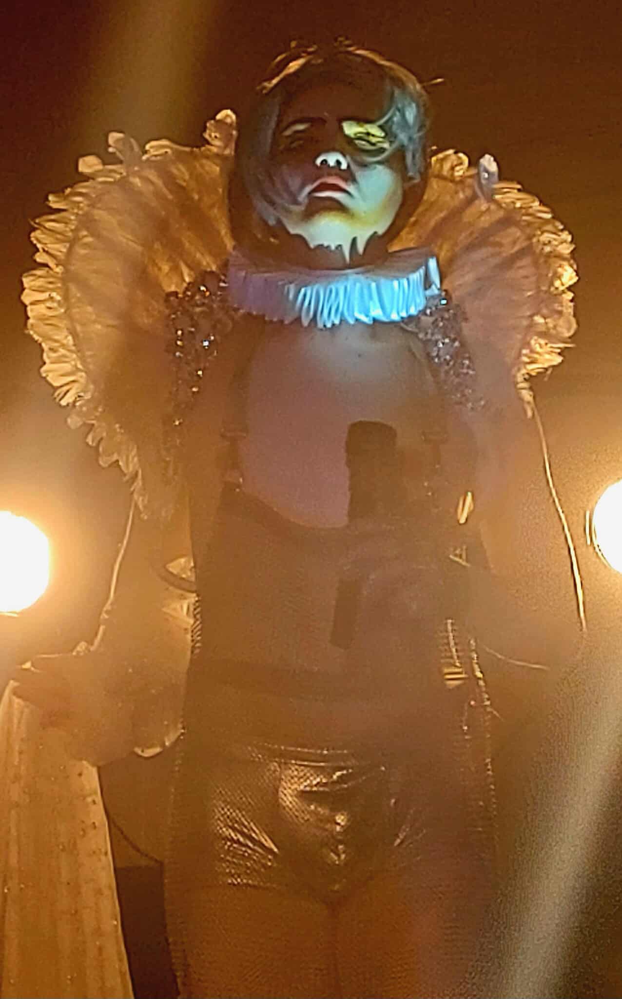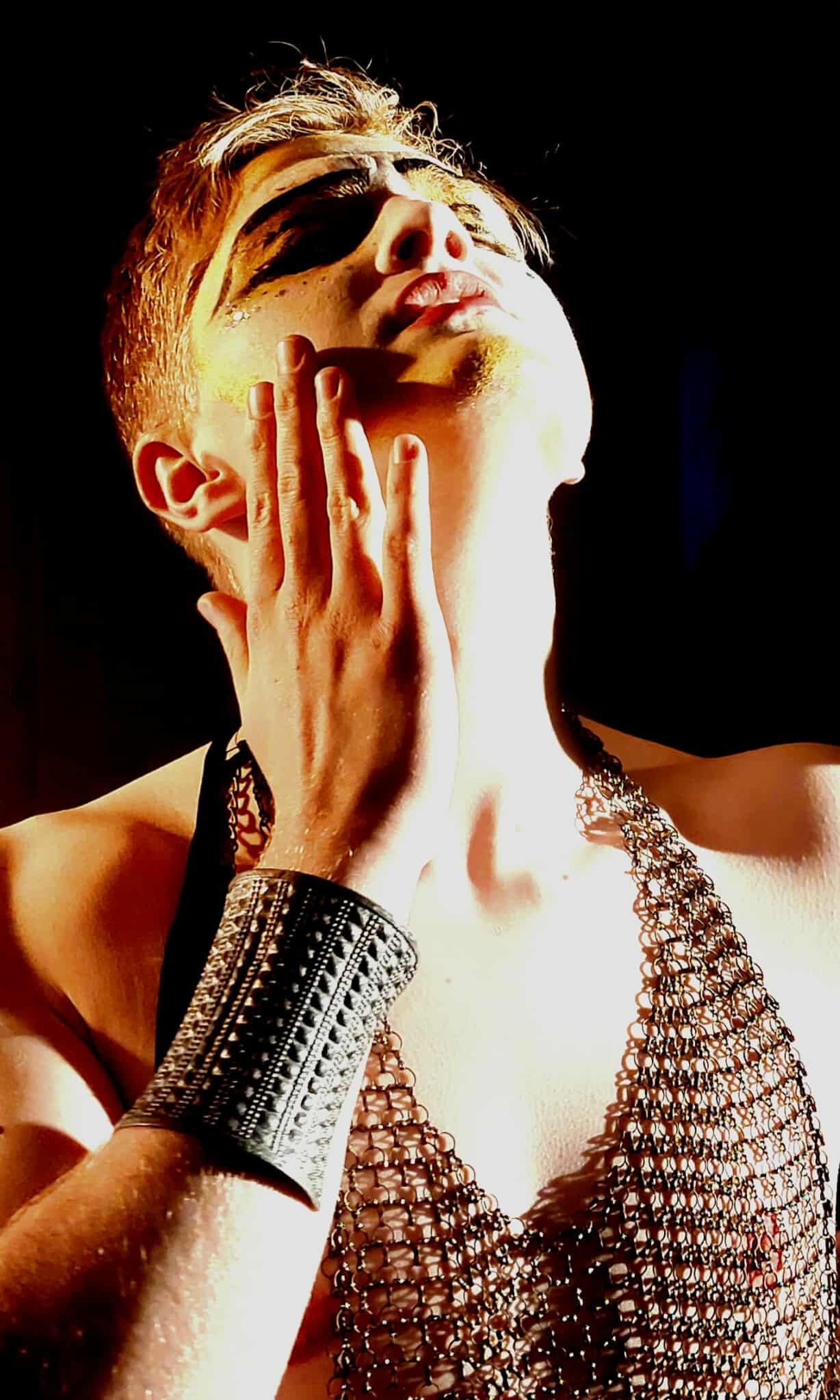 The Dragon Queen of Argos is staged in The Barney, at St Barnabus Anglican Church, with the audience seated on two sides and the performers raised on tiered platforms in the centre. Structurally, The Dragon Queen of Argos takes a post-dramatic approach, with scenes and sequences that bleed across storytelling, song, and stylised movement. Monologues reveal character and progress themes rather than plot, in a traditional sense.