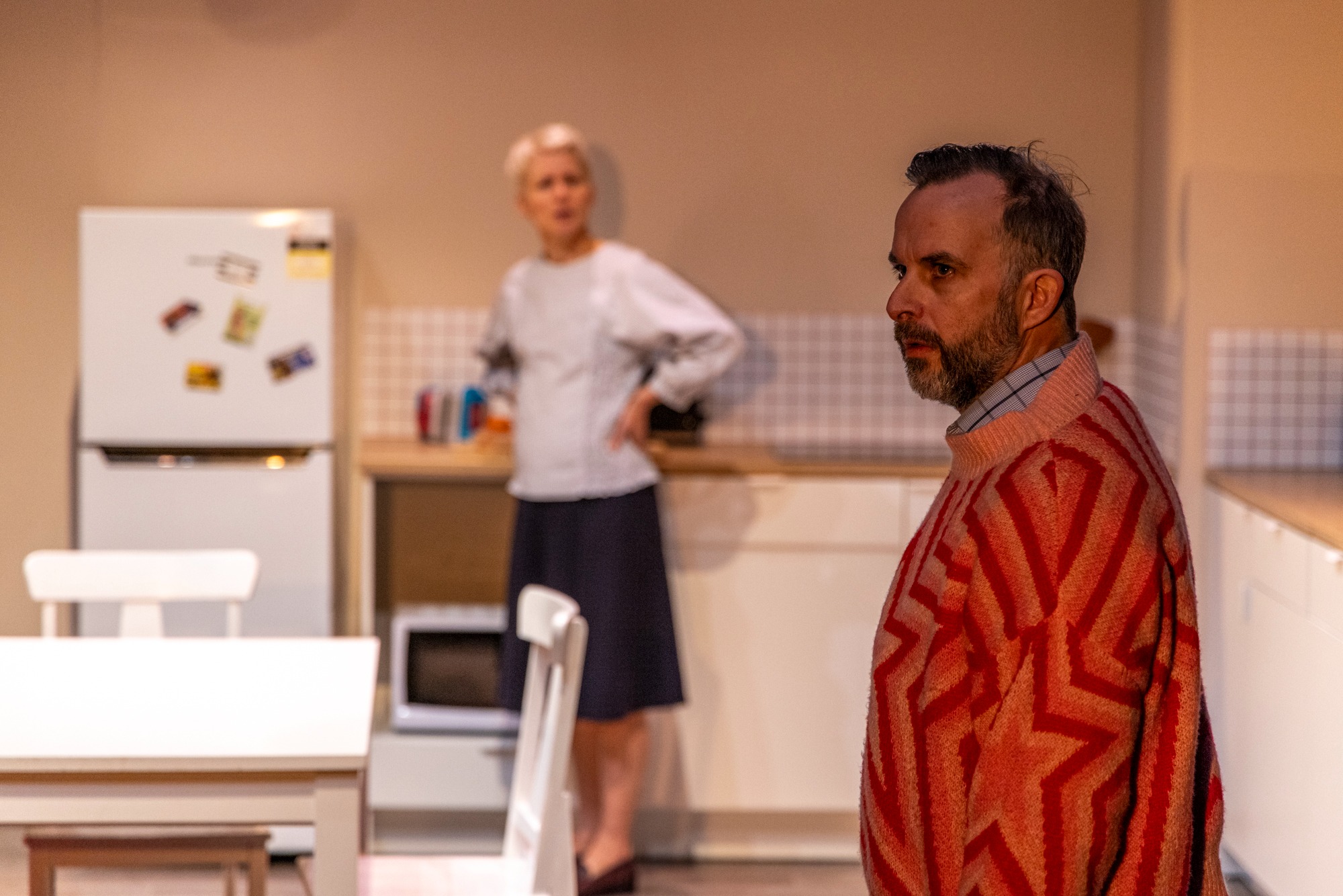 Lighting design by Clare Springett clarified the transitions between scenes and styles, from the warm light of the living room and double spotlights of monologues to neon LEDs in the fridge that represented Jess’ affair. Sound design by David Franzke further signposted these, and expanded these settings, including appropriate music during set changes and the jarring laugh track in the Sitcom scene.