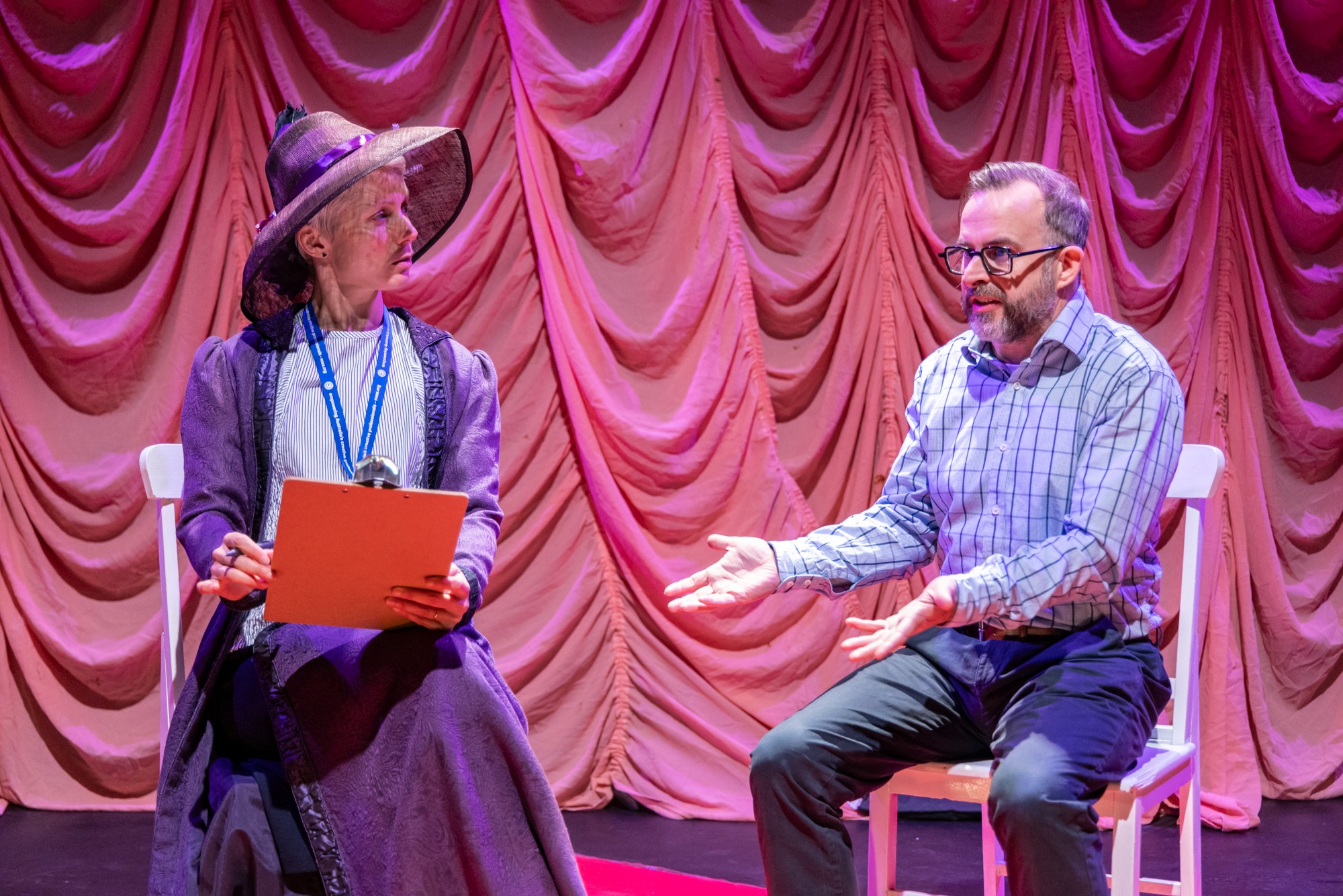 Set and costume design by Sarah Tulloch created the contrast between an ordinary kitchen, where most of the action took place, and the framing of a traditional theatre with red velvet curtains and shell-shaped footlight covers. The wheeled table and several chairs were shifted by the actors to build other settings – a café, a workplace break room, a psychologist’s office – throughout the play.
