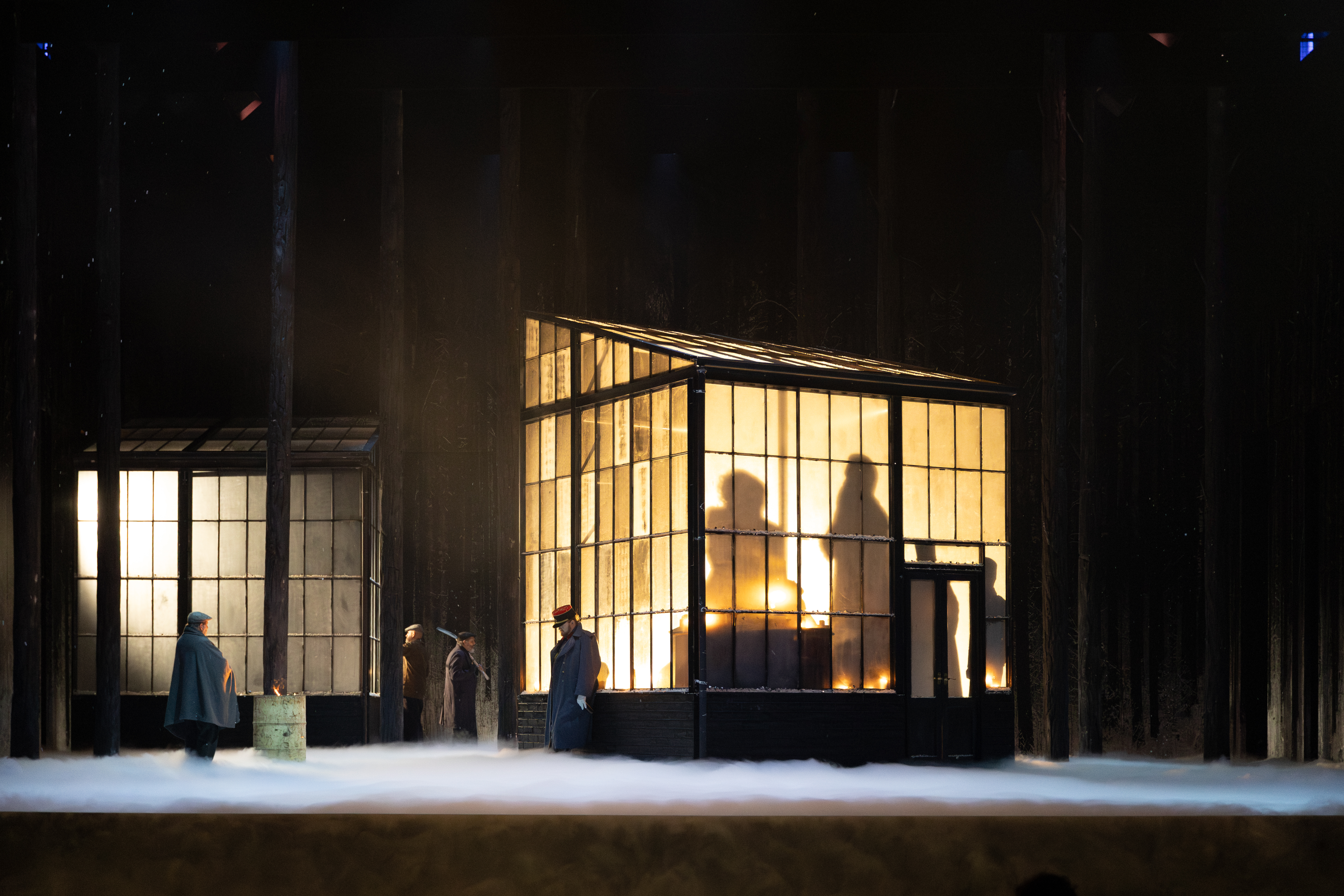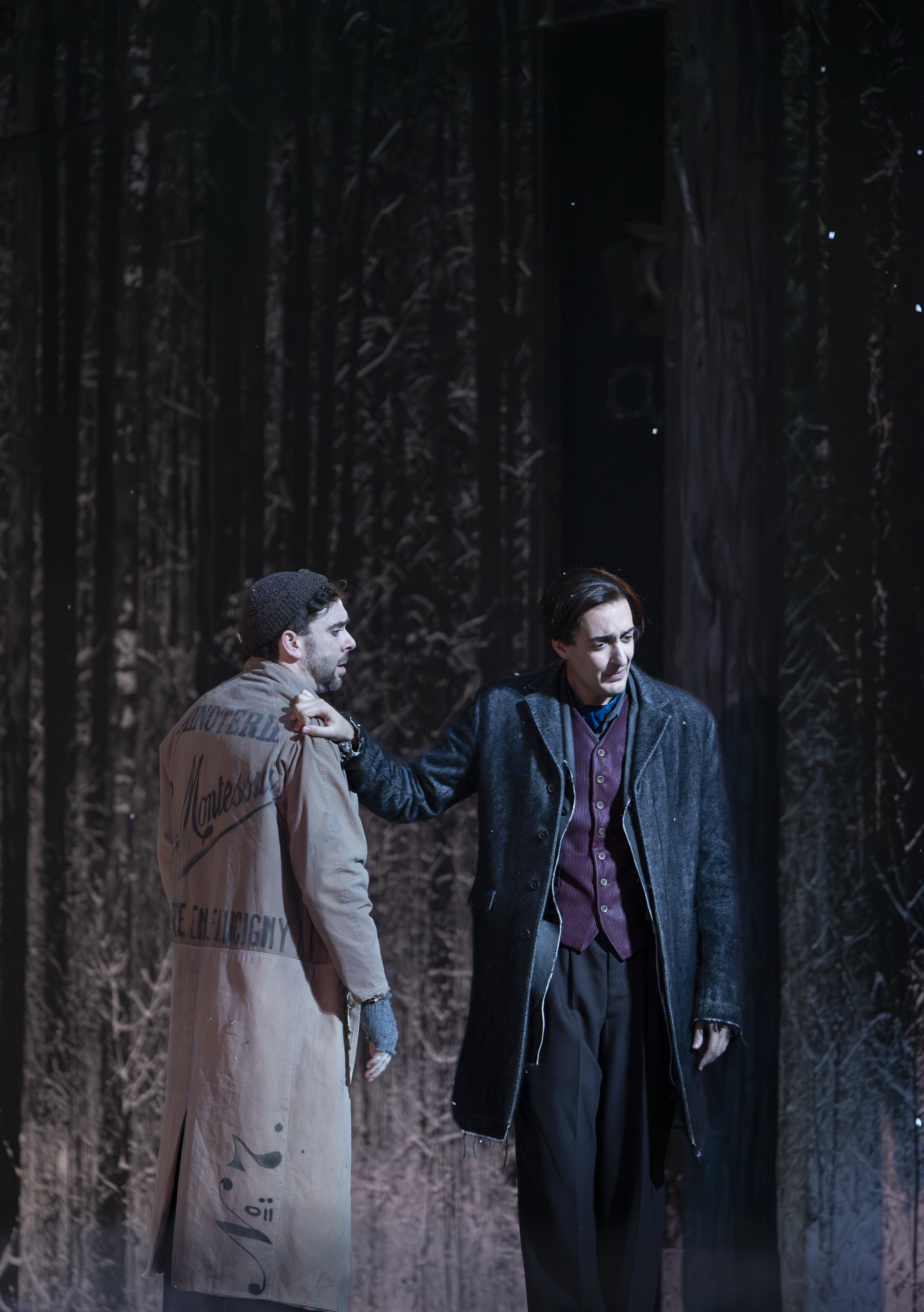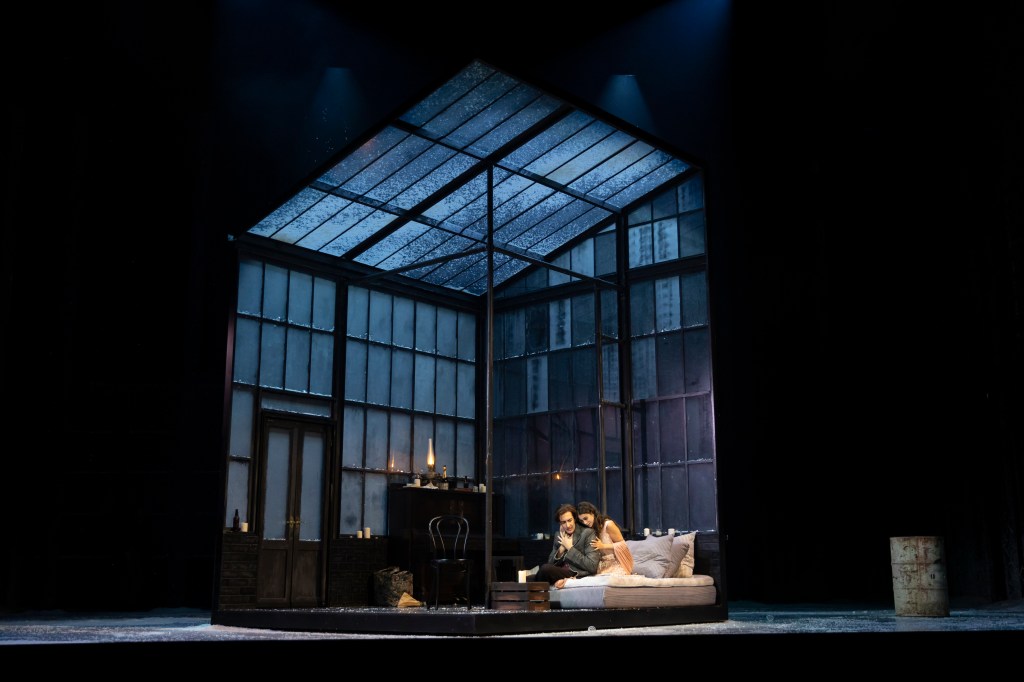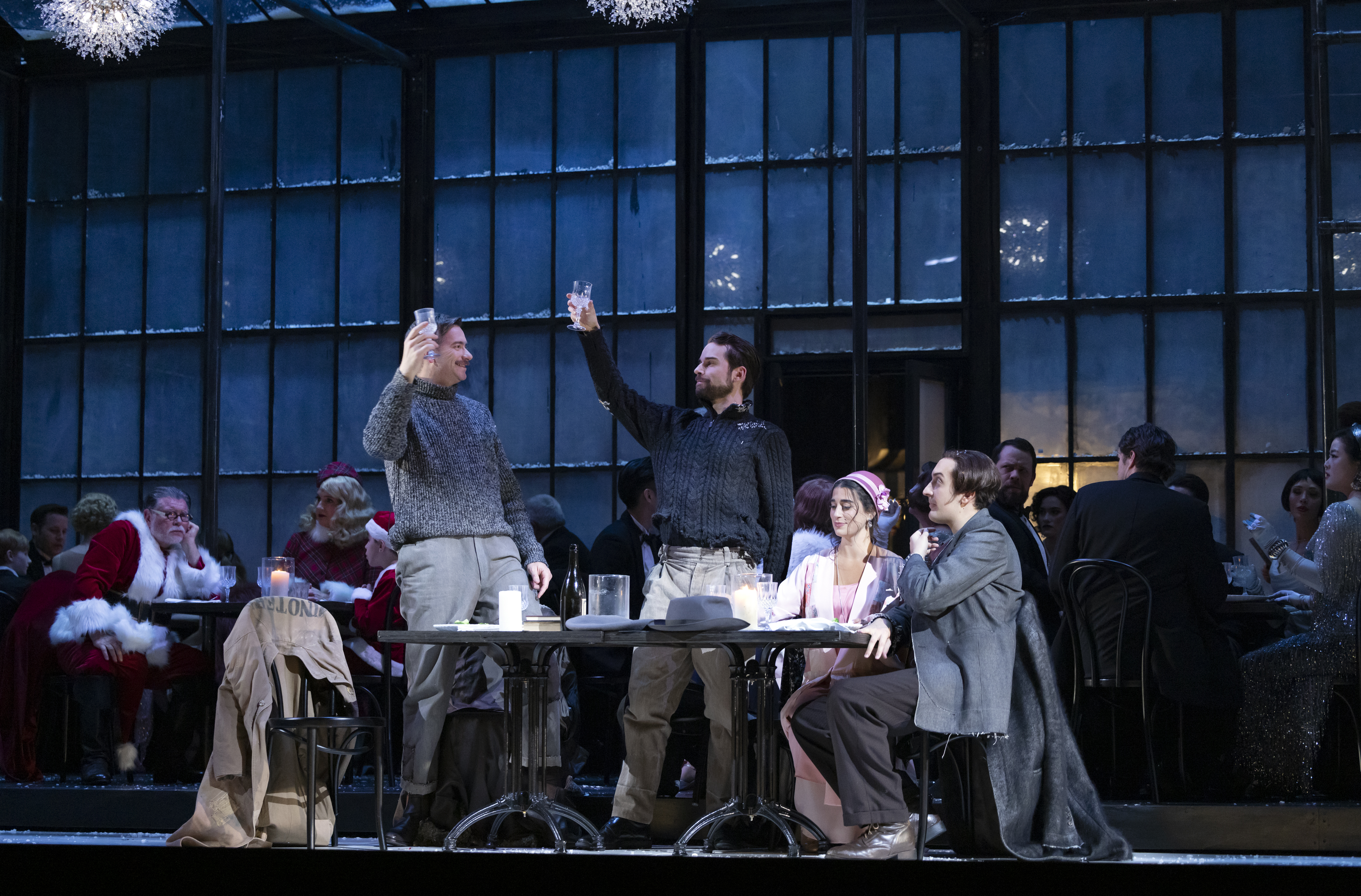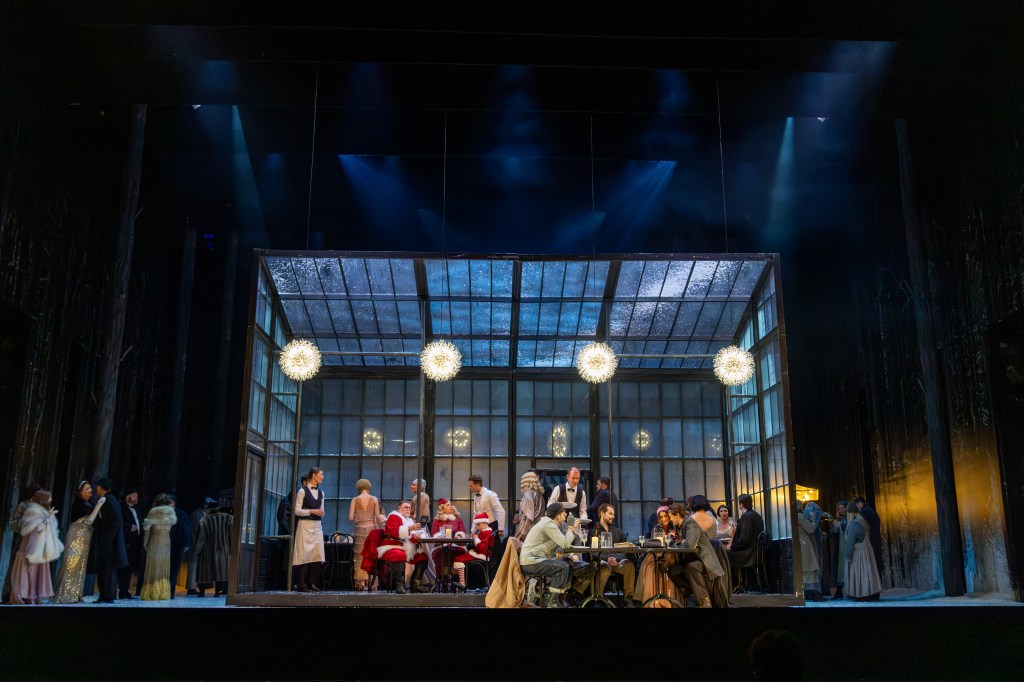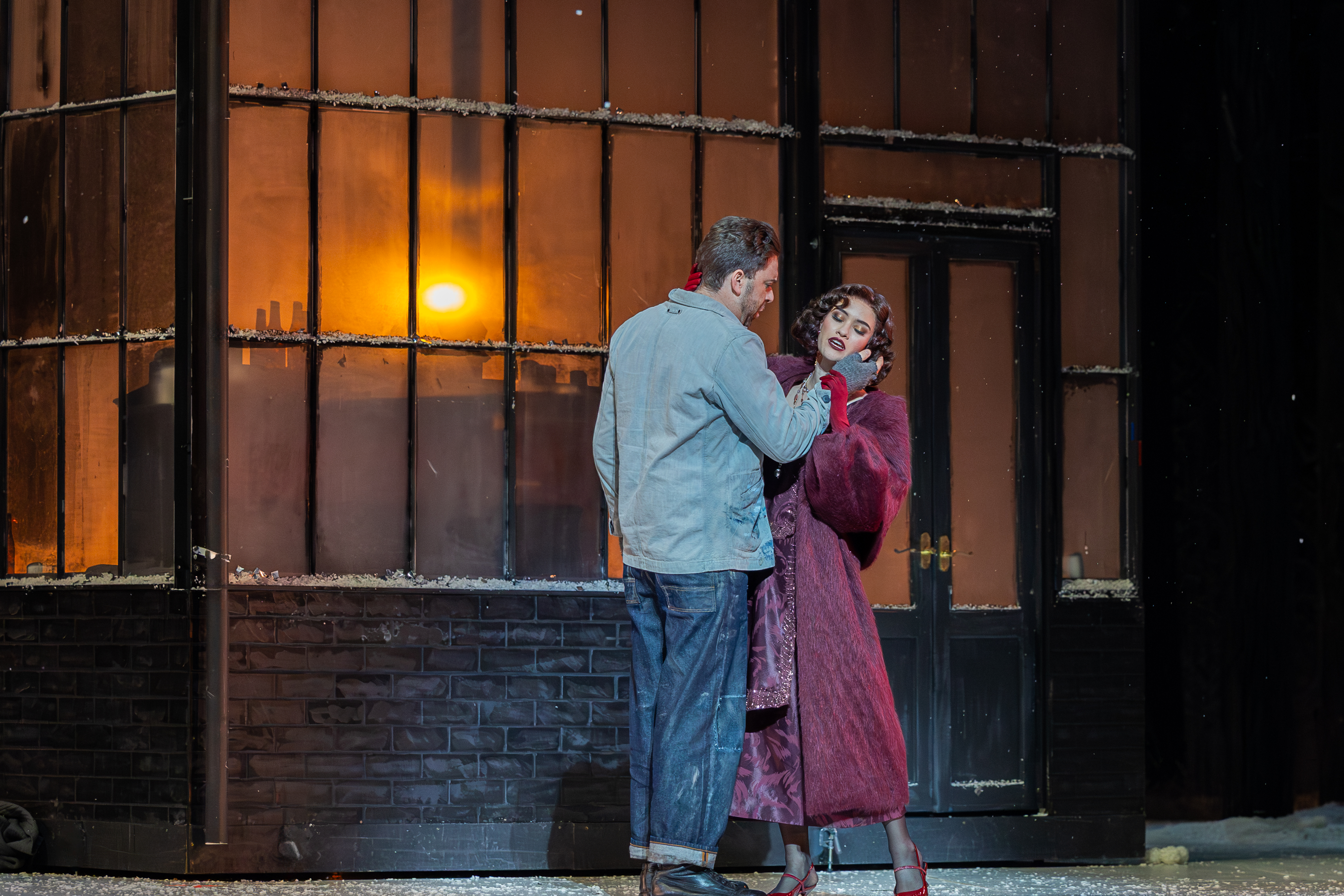 Set and costume design by Charles Davis was magnificent – the glass-walled apartment shared by Rodolfo and Marcello was used on a revolve in the first two acts, transitioning from the artists’ studio to the Café Momus. The otherworldly setting – simultaneously central to the cityscape and isolated in a quiet, snowy woodland – broke apart into separate locations in the second half of the performance.